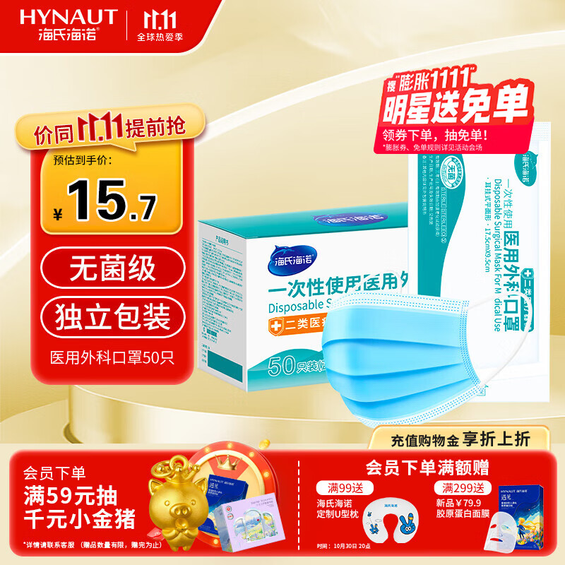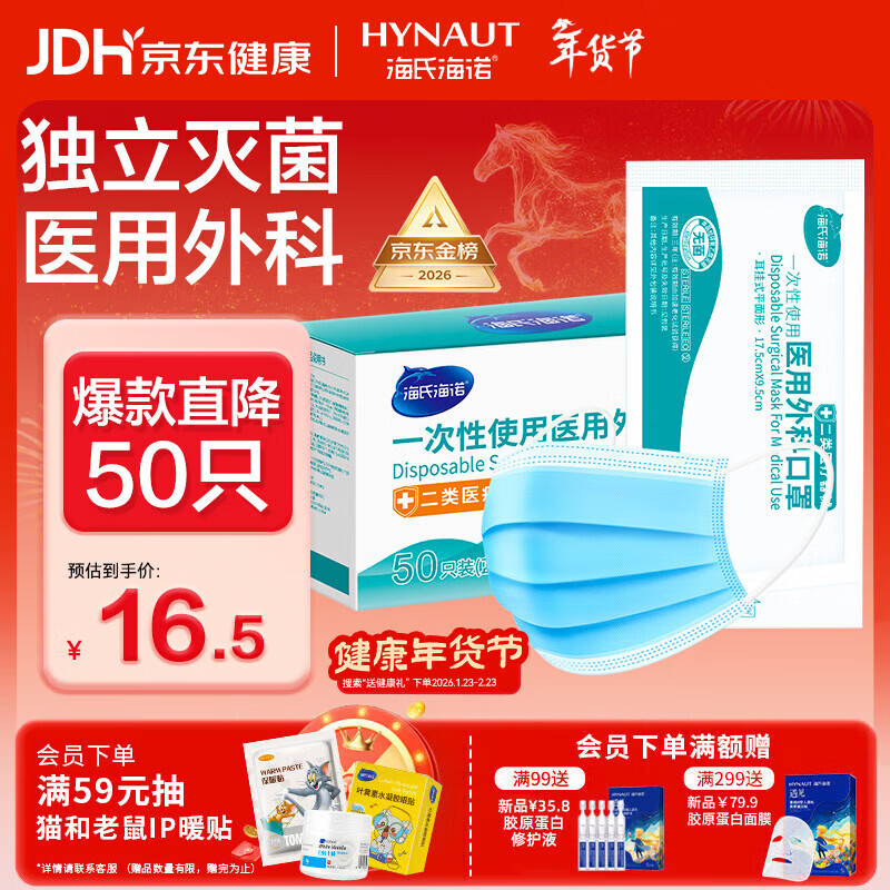 海氏海诺一次性医用外科口罩 灭菌级独立包装口罩一只一袋防尘保暖50只