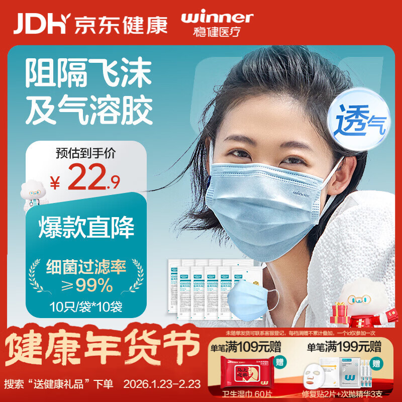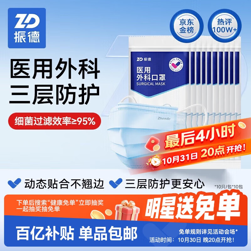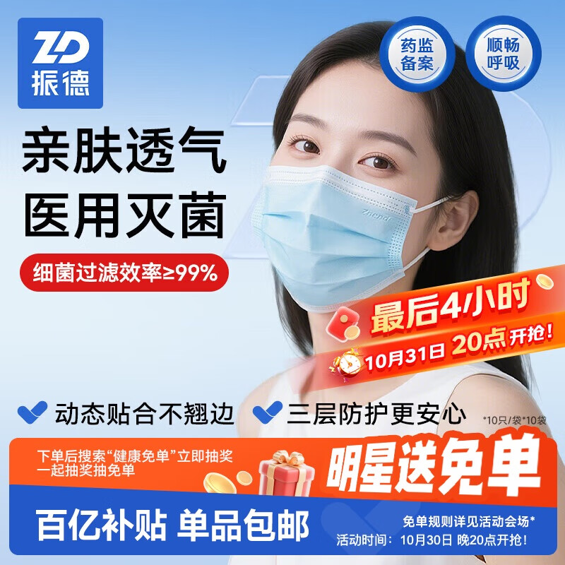 振德一次性医用外科口罩灭菌级成人透气冬季保暖防粉尘雾霾过敏100只