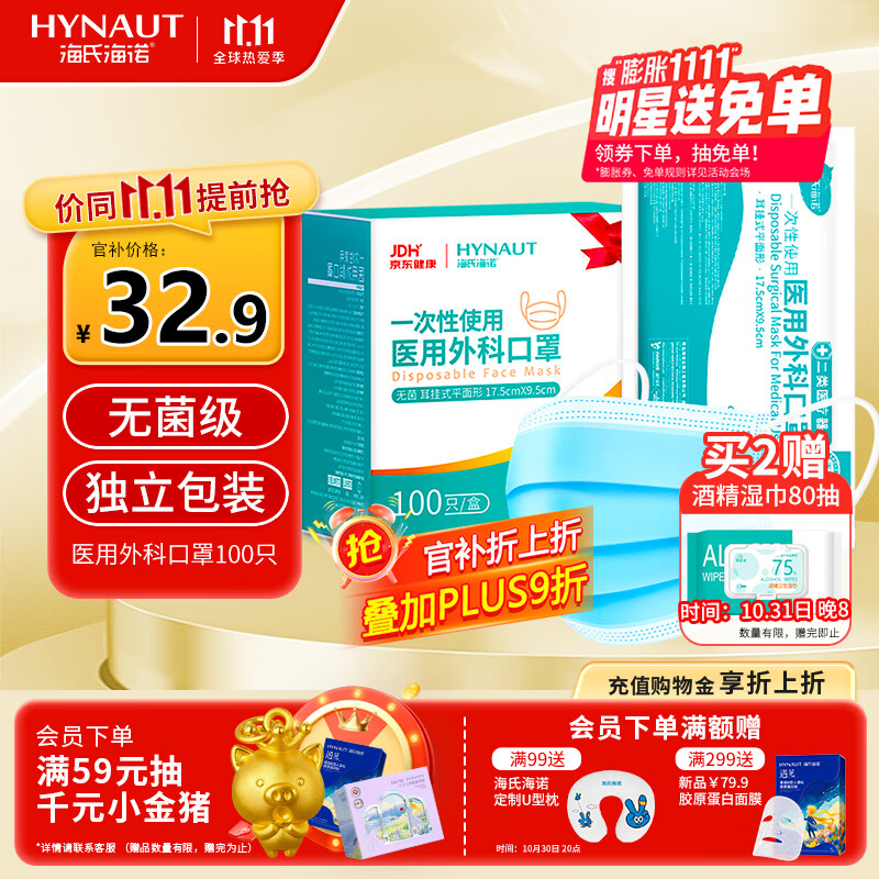 海氏海诺 一次性使用医用外科口罩100只 无菌三层防尘成人灭菌级防晒口罩
