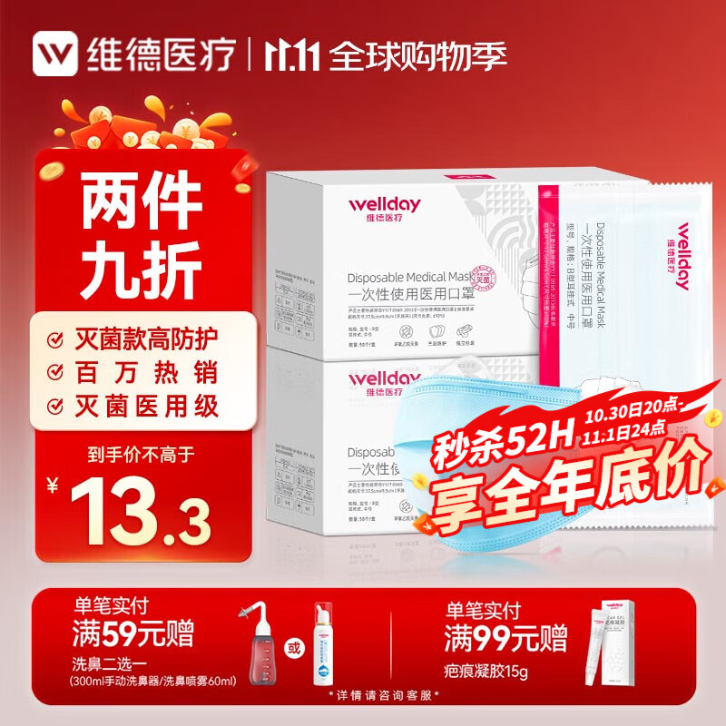 维德(WELLDAY)一次性医用口罩成人50只/盒独立包装三层透气防过敏防飞沫灭菌级