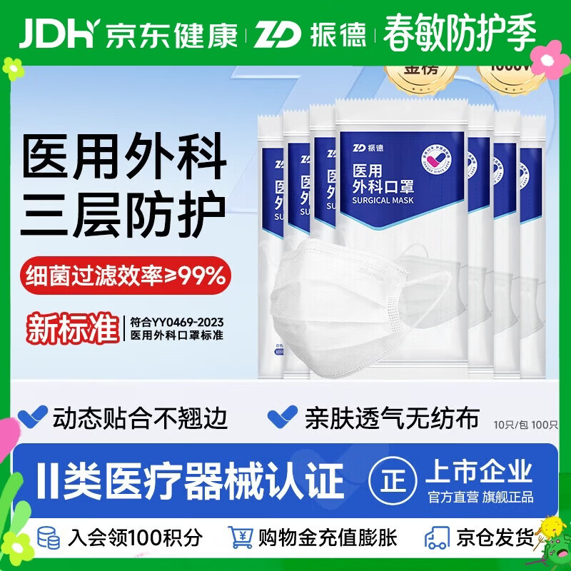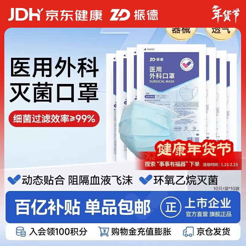 振德(ZHENDE)医用外科口罩成人一次性三层防护透气薄款防尘防细菌10只独立装 外科口罩【10只/袋*10】