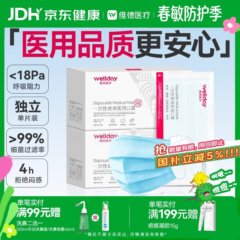 维德(WELLDAY)一次性医用外科口罩成人A1型耳挂式(无菌)防花粉过敏鼻50个/盒