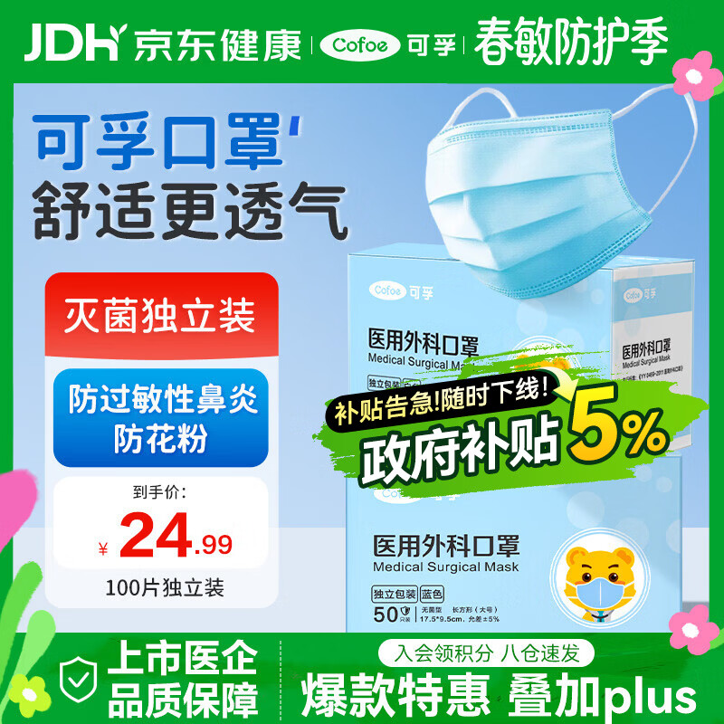 可孚医用外科口罩一次性口罩医用灭菌级防花粉过敏性鼻炎100只独立装