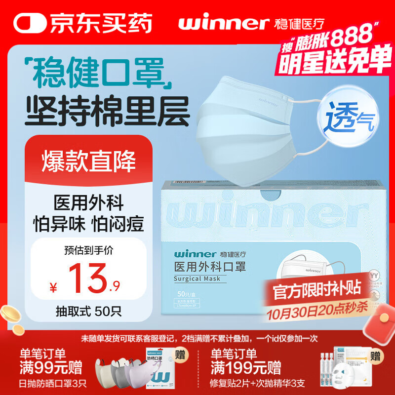 稳健一次性医用外科口罩独立50只 三层防护棉里层亲肤透气防过敏防尘