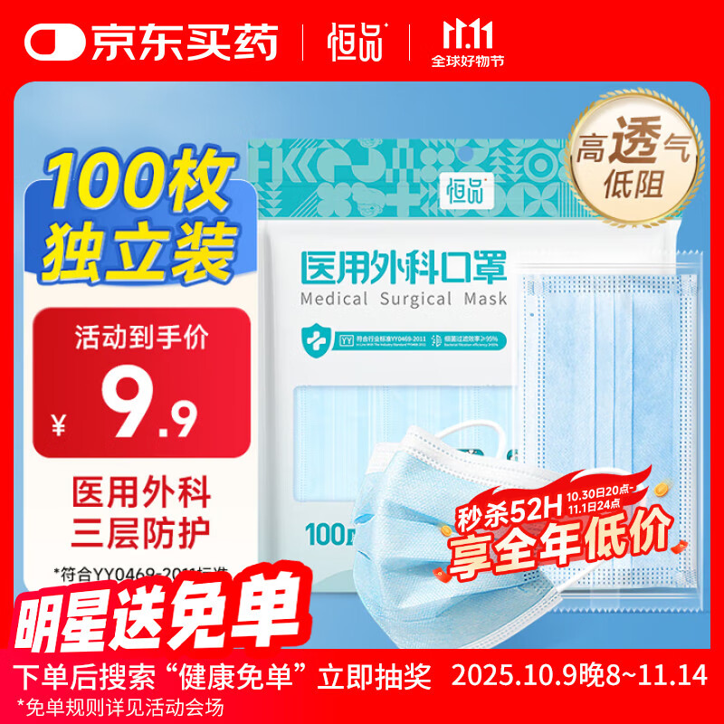 恒品一次性医用外科口罩100只(独立装)防尘亲肤透气防花粉鼻炎保暖