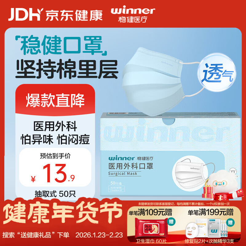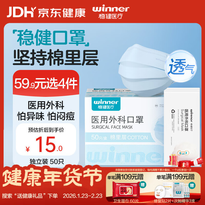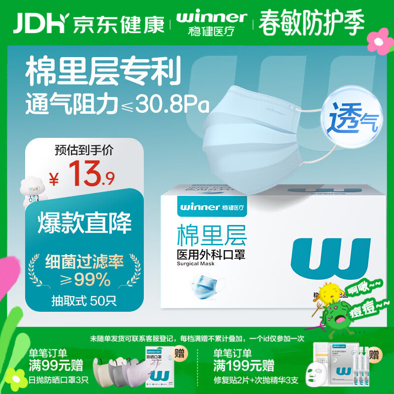 稳健一次性医用外科口罩50只/盒 棉里层亲肤透气防尘防花粉过敏性鼻炎