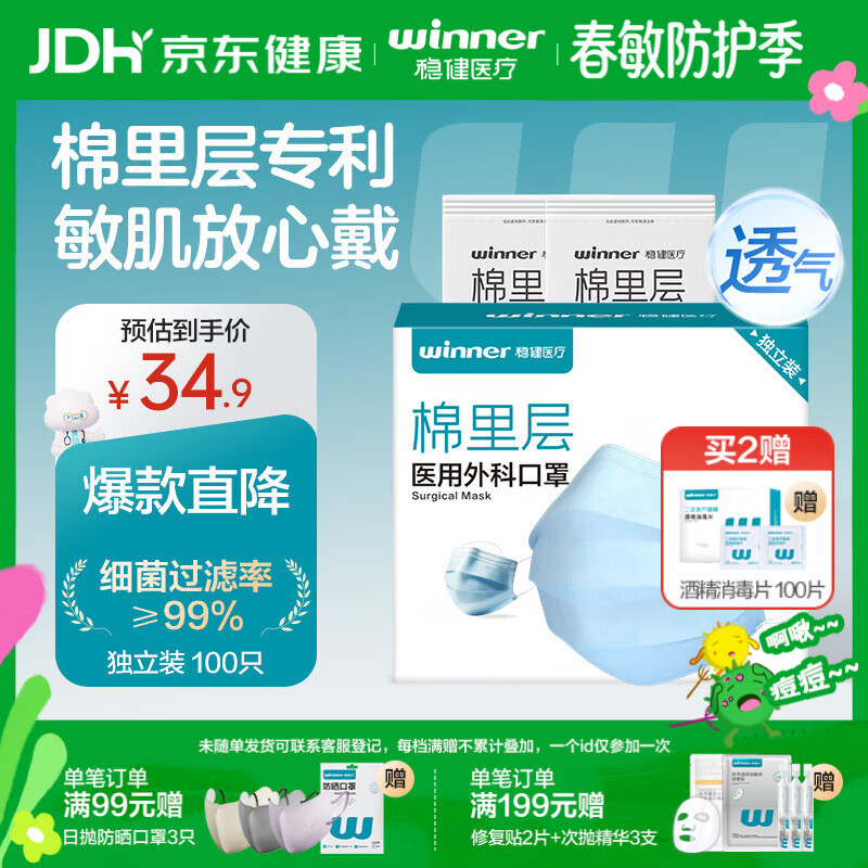 稳健一次性医用外科口罩100只独立装棉里层亲肤口罩防过敏性鼻炎