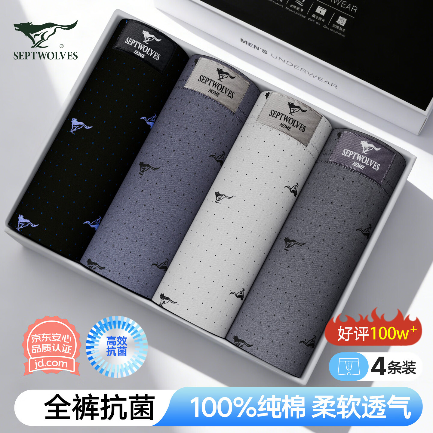 七匹狼内裤男士纯棉7A抗菌平角裤舒适透气中腰防卷边高弹男式四角裤头