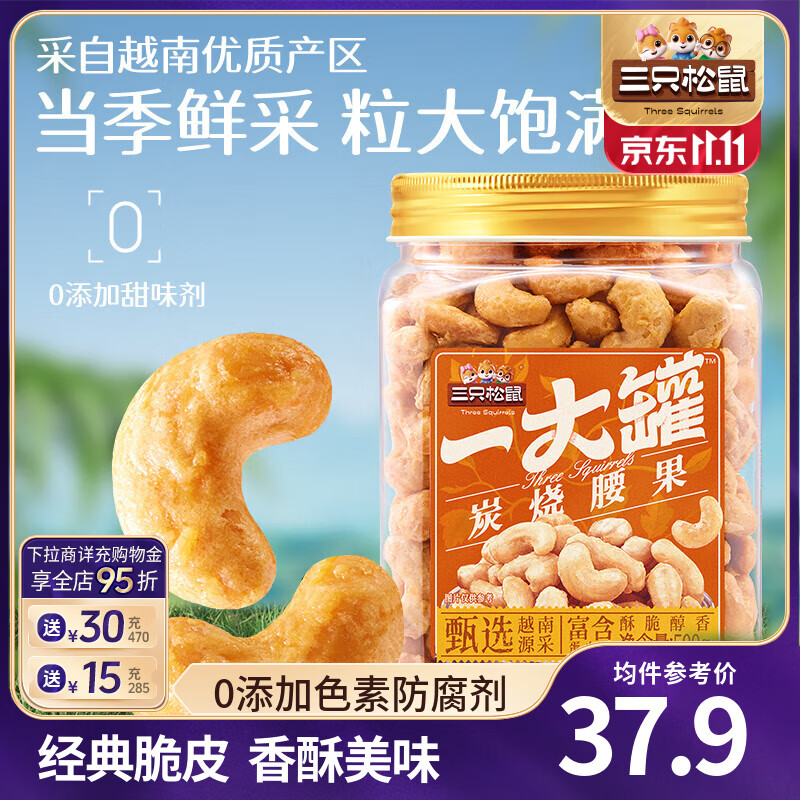 三只松鼠炭烧腰果罐装大颗粒休闲零食坚果炒货孕妇健康干果特产节日送礼 【罐装】炭烧腰果500g*2罐