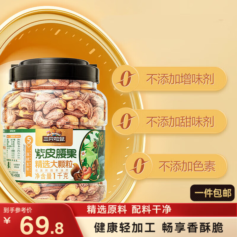 三只松鼠大颗粒紫皮腰果1000g 罐装坚果炒货干果腰果仁零食 团购送礼