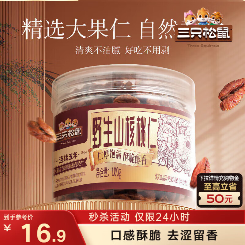 三只松鼠野生山核桃仁 每日坚果炒货休闲零食免剥果仁罐装100g/罐