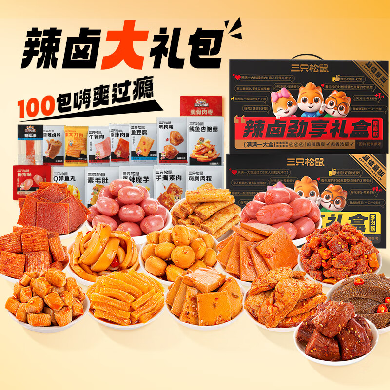 三只松鼠辣卤礼包100包_零食大礼包整箱卤味肉类休闲食品夜宵解饿 辣卤大礼盒约810g/多肉款/100包