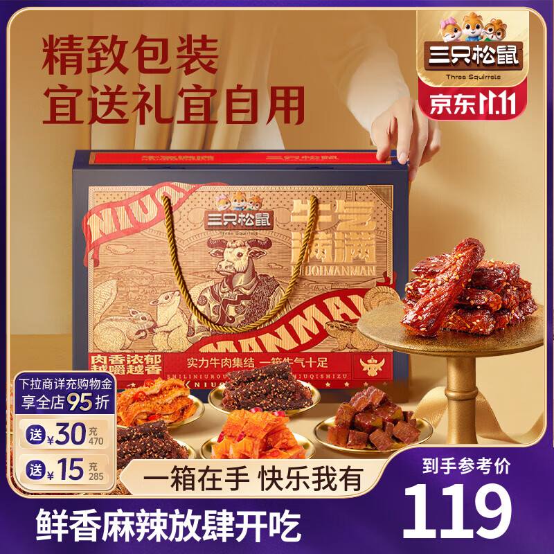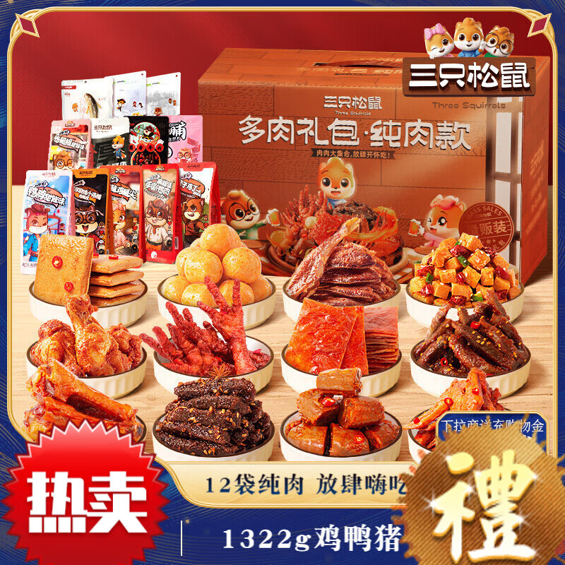 三只松鼠三只松鼠全肉零食大礼包_牛肉鸭肉多肉麻辣卤味熟食即食夜 9包荤素搭配超满足聚汇款1103