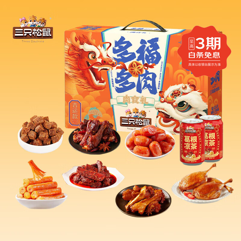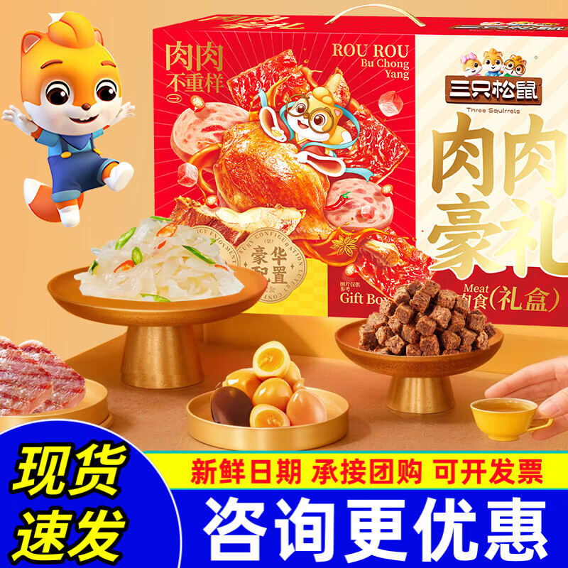 三只松鼠(Three Squirrels)【礼盒下午2点下架】三只松鼠_全肉类零食大礼包_牛肉干鸡爪送礼 多肉礼包/纯肉款1346g