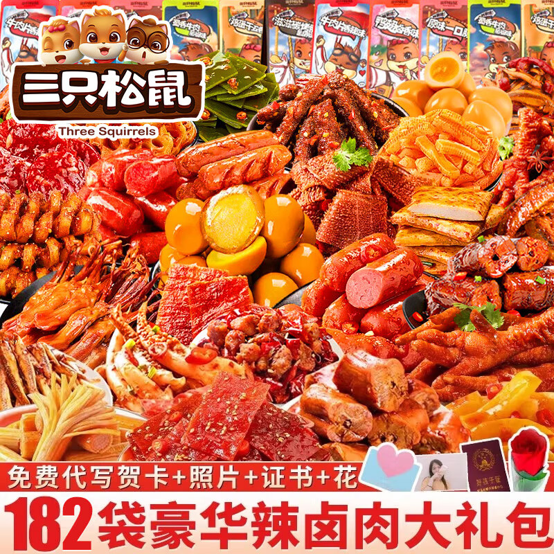 三只松鼠辣卤味零食大礼包肉食类成人整箱送女友礼物巨型网红小吃休闲食品 辣卤91袋+91袋/2箱共182袋1220g