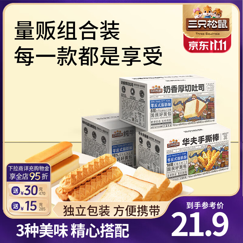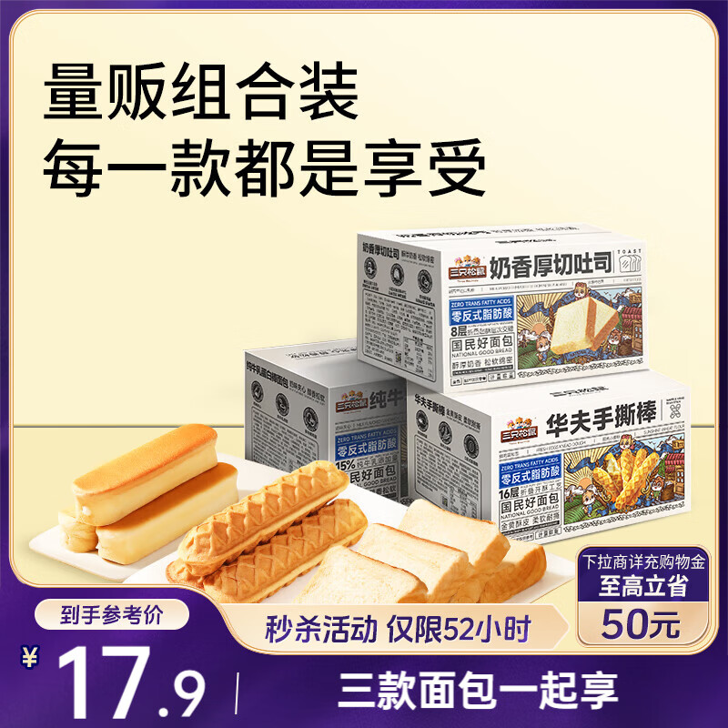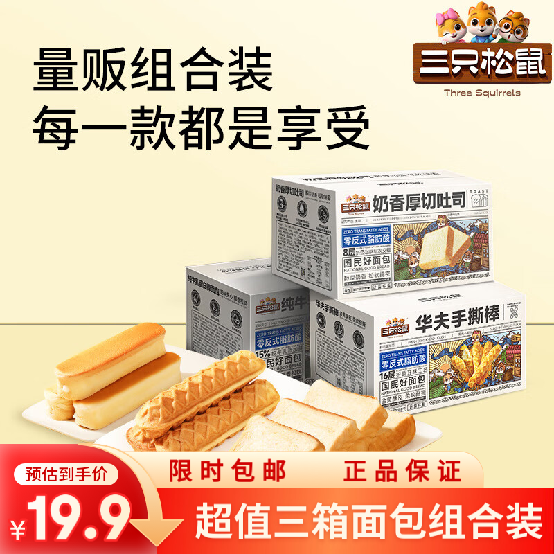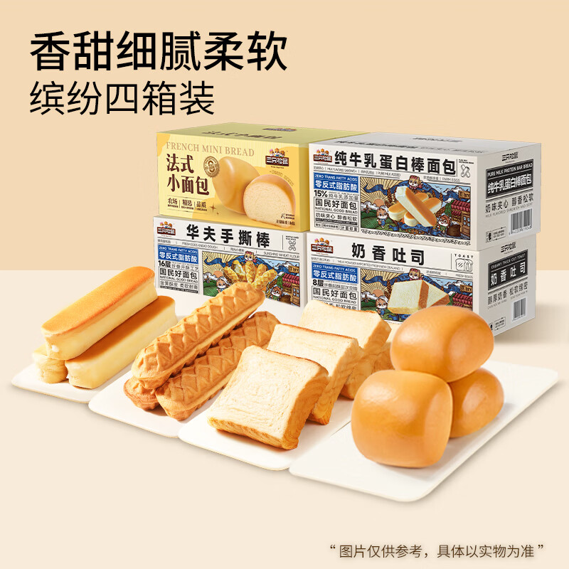 三只松鼠面包组合3箱696g 厚切吐司牛乳蛋白棒手撕面包糕点 面包组合3箱696g