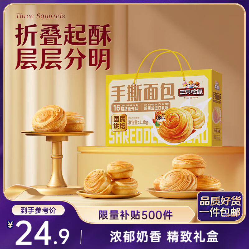 三只松鼠手撕面包早餐面包代餐蛋糕糕点点心健康吐司休闲零食食品礼盒整箱 【约10-12个】手撕面包500g*1箱