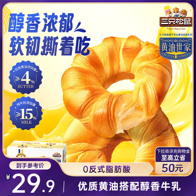 三只松鼠黄油奶圈手撕面包700g 早餐面包吐司蛋糕办公室下午茶饱腹代餐