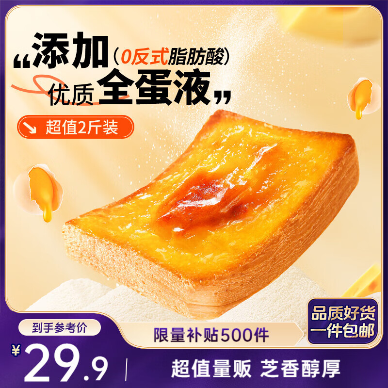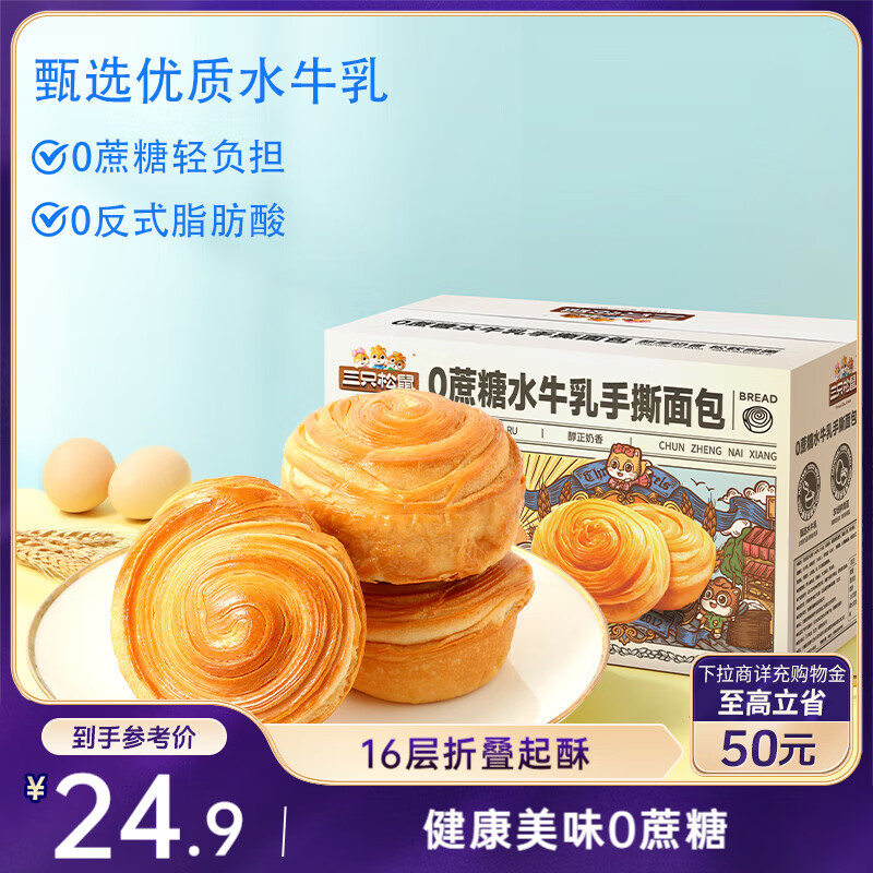 三只松鼠0蔗糖水牛乳手撕面包1kg 早餐面包营养饱腹代餐酵母蛋糕零食糕点