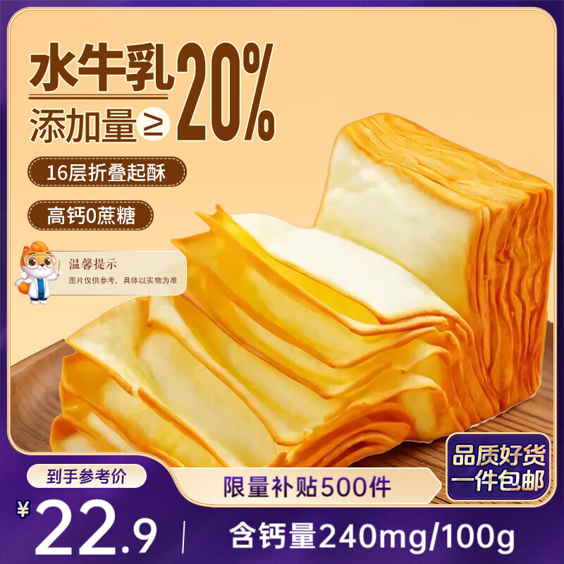 三只松鼠水牛乳千层吐司1000g 厚切面包早餐休闲零食手撕代餐饱腹点心