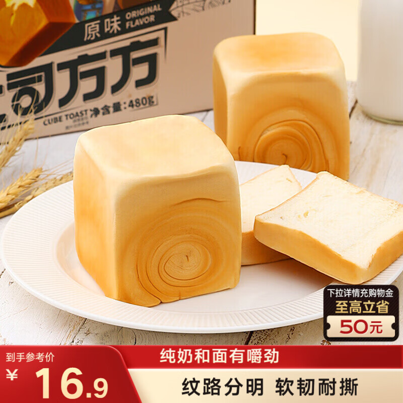 三只松鼠吐司方方 纯奶吐司面包早餐代餐手撕休闲零食点心480g/6枚装