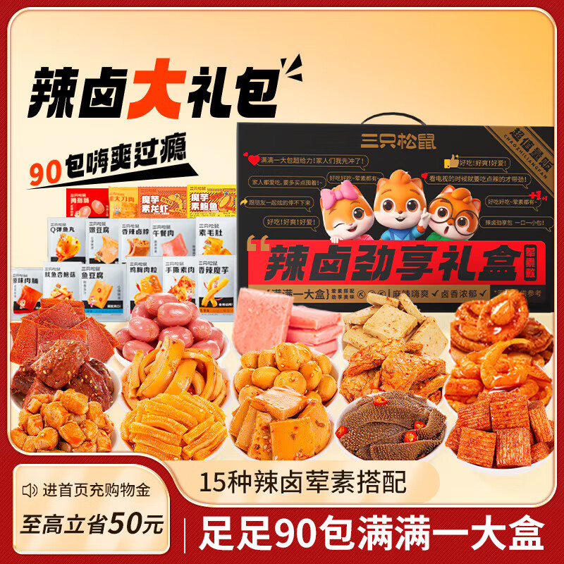 三只松鼠辣卤大礼盒90包 辣条魔芋爽猪肉脯卤味解馋零食大礼包送礼625g