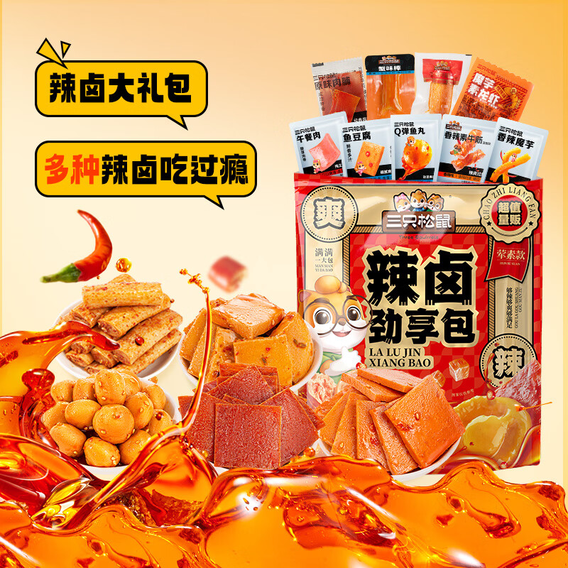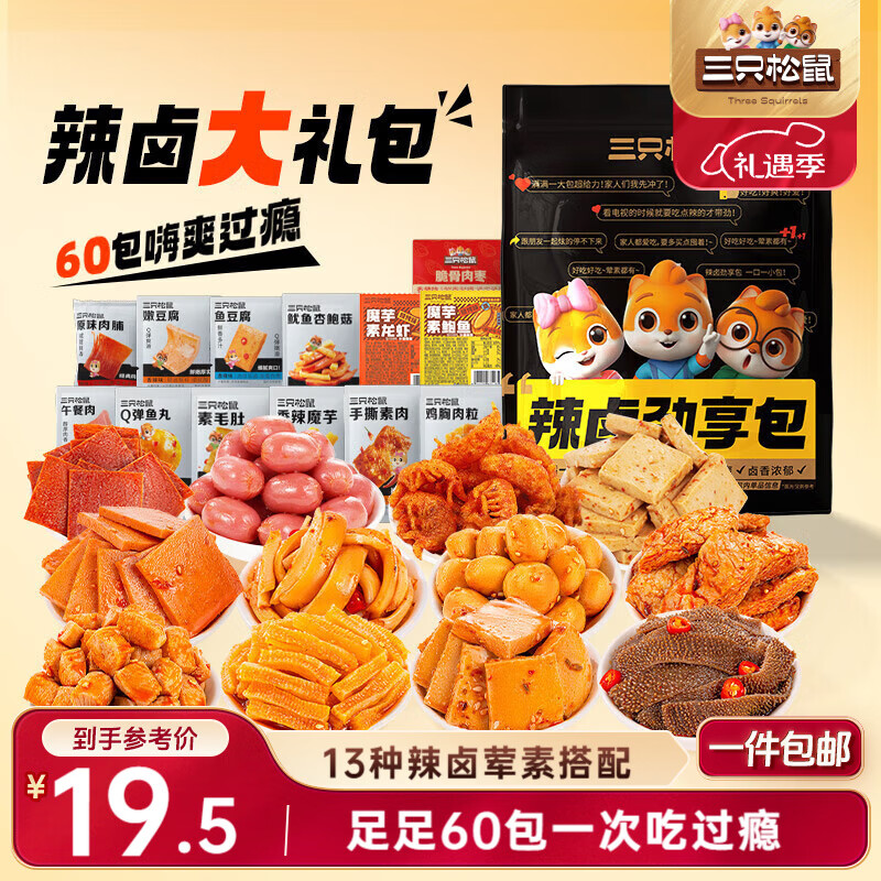 三只松鼠辣卤礼包乐享款60包 辣条魔芋爽豆干卤味解馋休闲零食大礼包440g