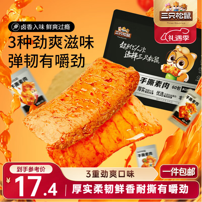 三只松鼠手撕素肉60包 素牛排豆干素食辣条卤味儿时怀旧小吃休闲零食540g