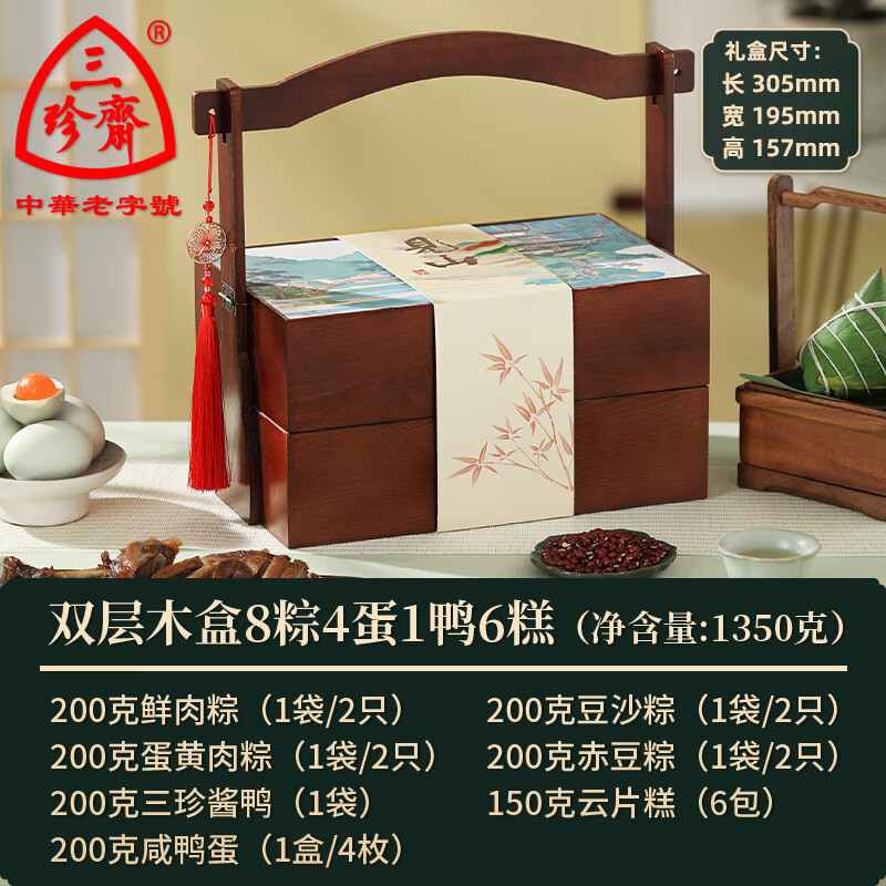 三珍斋嘉兴粽子礼盒装蛋黄鲜肉甜粽咸鸭蛋粽子端午节礼品8粽4蛋1鸭1挂坠 双层实木