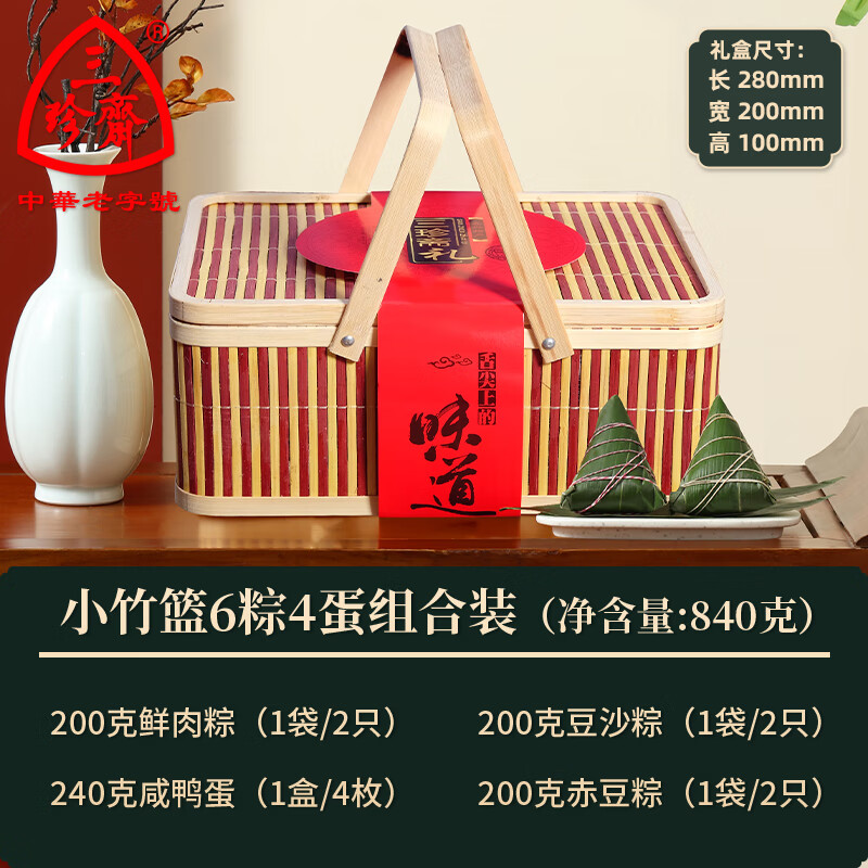 三珍斋嘉兴特产竹篮粽子礼盒蛋黄鲜肉粽子端午节礼物团购送礼品 三珍福礼:8粽4蛋礼盒