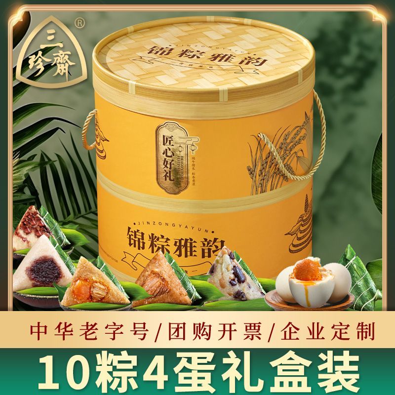 三珍斋端午礼盒粽子礼盒装定制嘉兴特产甜豆沙蛋黄肉粽端午节礼品送礼团 【金黄雅韵】10粽4蛋礼盒1240g