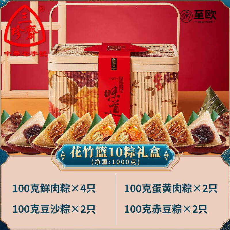 食芳溢三珍斋嘉兴粽子礼盒装蛋黄鲜肉粽赤豆甜粽子特产端午节送礼品团购 10粽4味6荤4素【花竹篮】