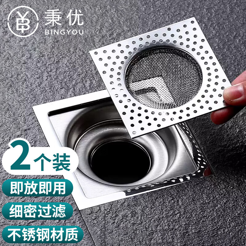 秉优不锈钢地漏过滤网2个装 方形卫生间下水道浴室通用防堵塞毛发过滤