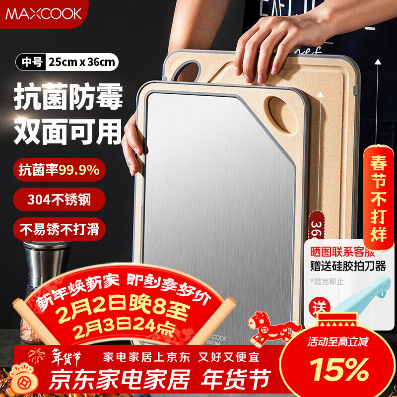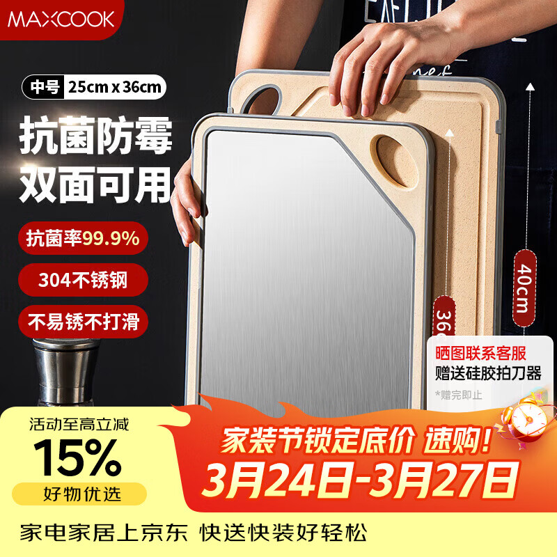 美厨(MAXCOOK)304不锈钢砧板菜板 抗菌防霉案板切水果双面粘板中号36*25.5*1cm