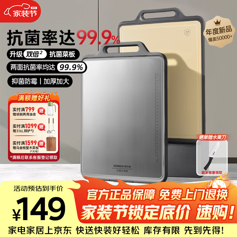 康巴赫(KOBACH)新款双面抗菌菜板 不锈钢砧板加厚案板不易发霉家用切菜板擀面板