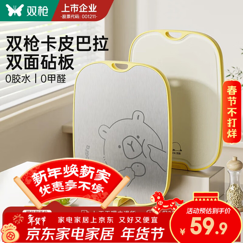 双枪菜板家用抗菌砧板不锈钢双面切菜板厨房案板水果粘板 卡皮不锈钢PP双面砧板33.5*25*1cm
