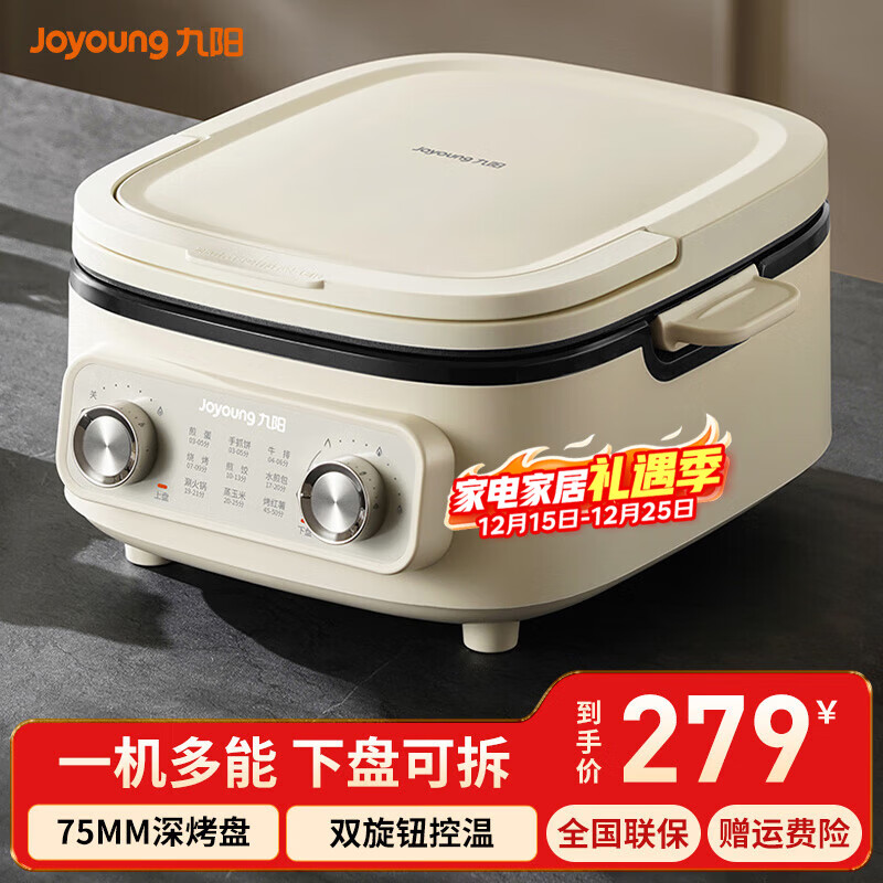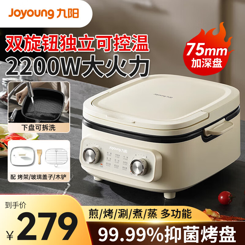 九阳电饼铛一机多能煎烤机三明治机早餐机75mm深盘大火力多功能电火锅下盘可拆洗烤肉 奶油白