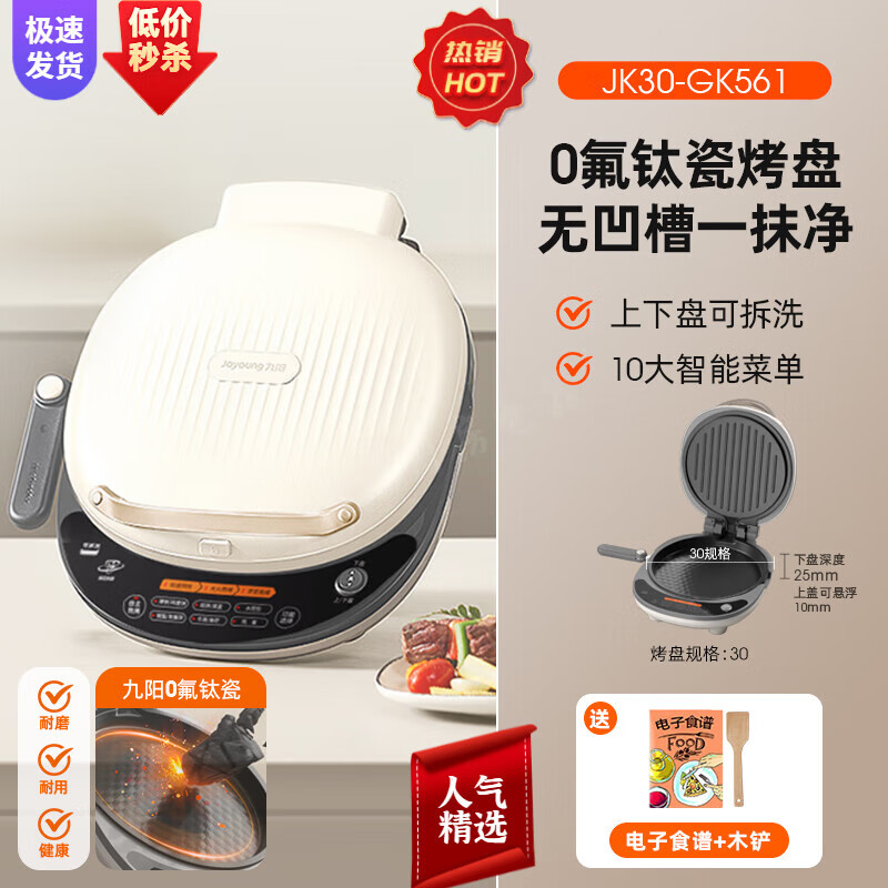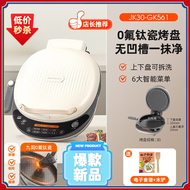 九阳电饼铛家用双面加热可拆洗电饼档加深加大新款钛瓷烙饼煎饼锅 奶白色上下双拆盘 +智能菜单+25mm深盘