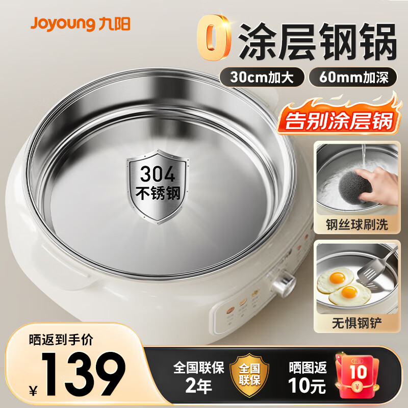 九阳电饼铛家用电火锅304不锈钢0涂层多功能锅烙饼煎包锅 煎烤烙涮煮一体平底锅煎烤机 奶油白