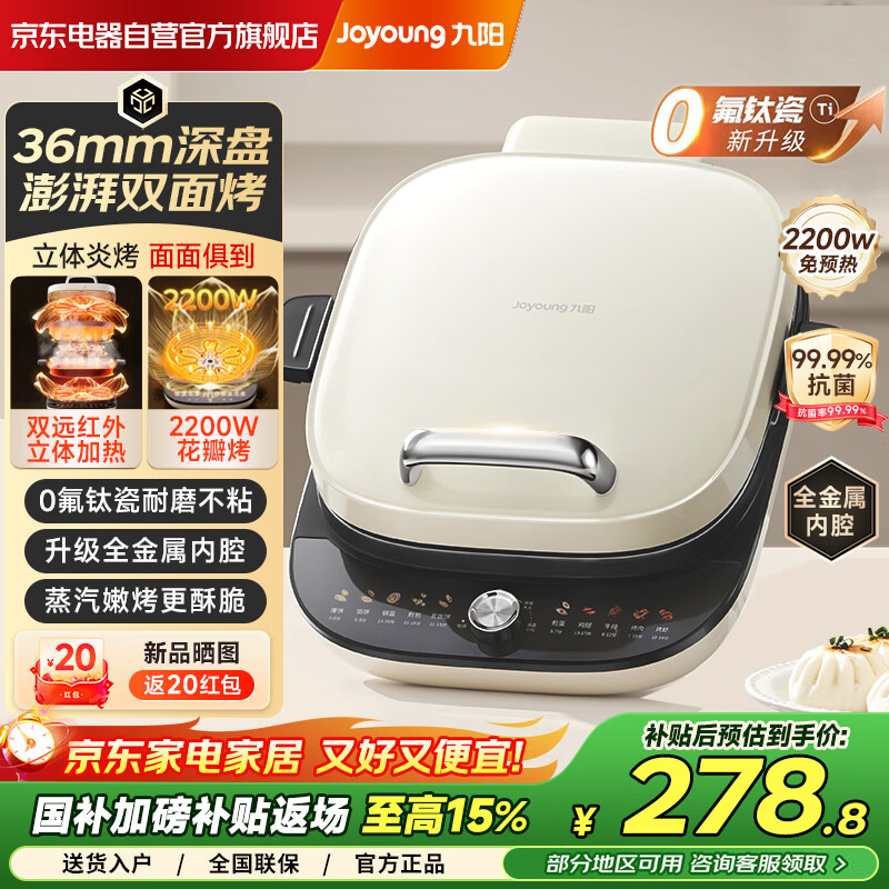 九阳电饼铛 电饼档 远红外双面加热 36mm加大加深烙饼 2200W花瓣烤 三明治煎烤锅可拆洗0氟钛瓷电煎锅