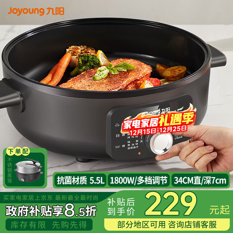 九阳电饼铛家用一机多能双旋钮独立控温电饼铛 75mm深盘大火力秒涮多功能锅火锅煮锅 GK571