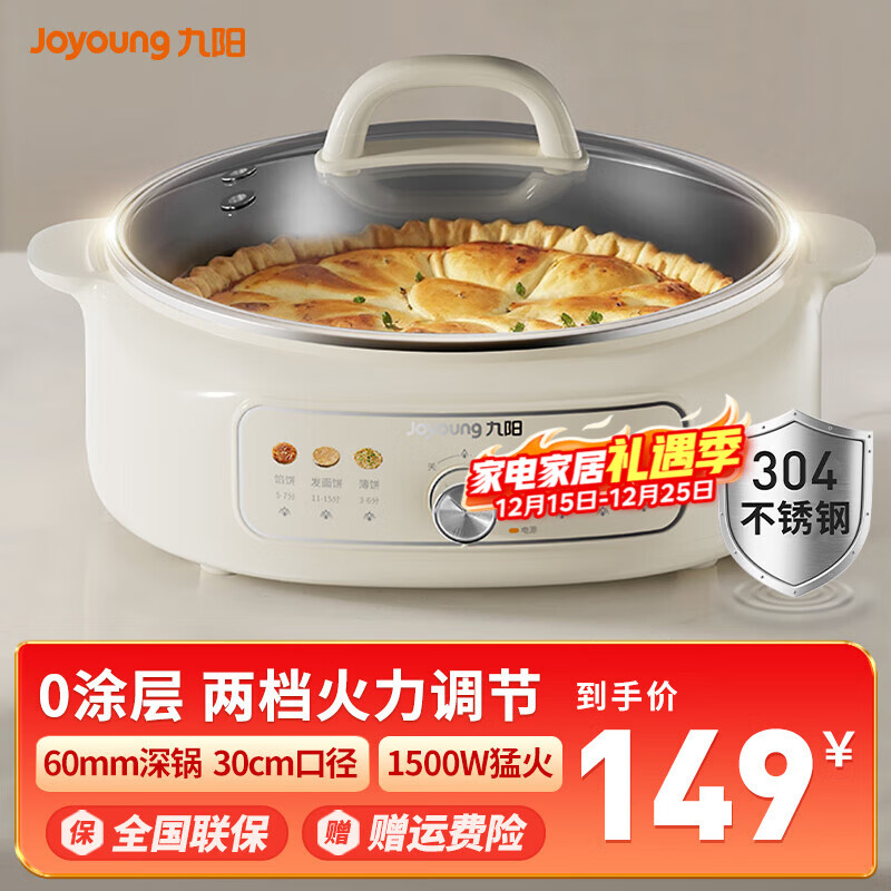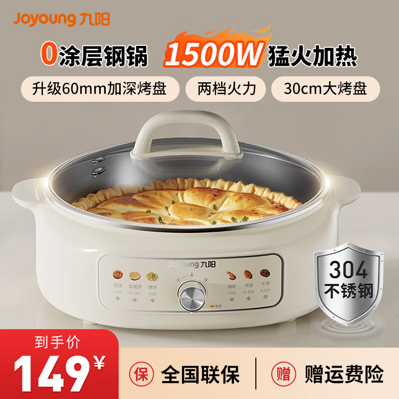 九阳电饼铛家用304不锈钢0涂层多功能锅烙饼锅煎烤烙涮煮一体烤肉锅30cm大烤盘丨60mm加深 奶油白【两档火力调节】