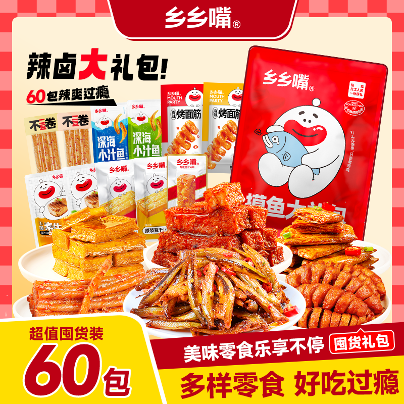 乡乡嘴辣条零食大礼包60包虎皮豆干解馋小零食宿舍春节年货零食礼包810g