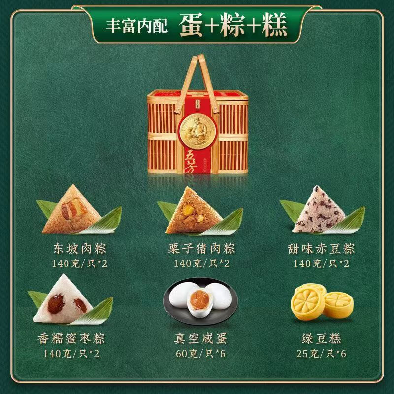 五芳斋嘉兴五芳斋粽子礼盒装双层竹篮韵味五芳甜绿豆糕咸鸭蛋1630g送礼 五芳斋韵味