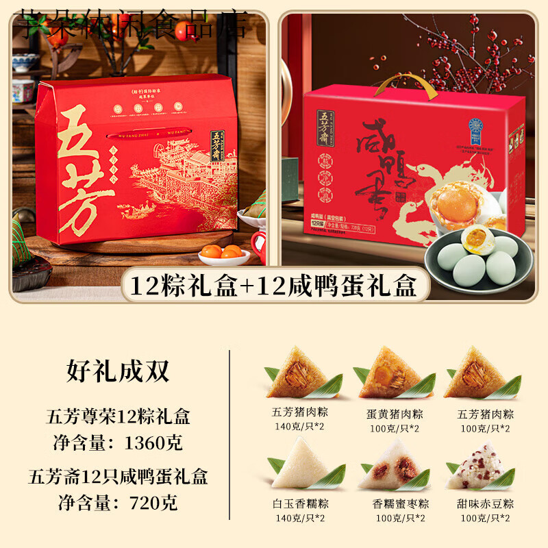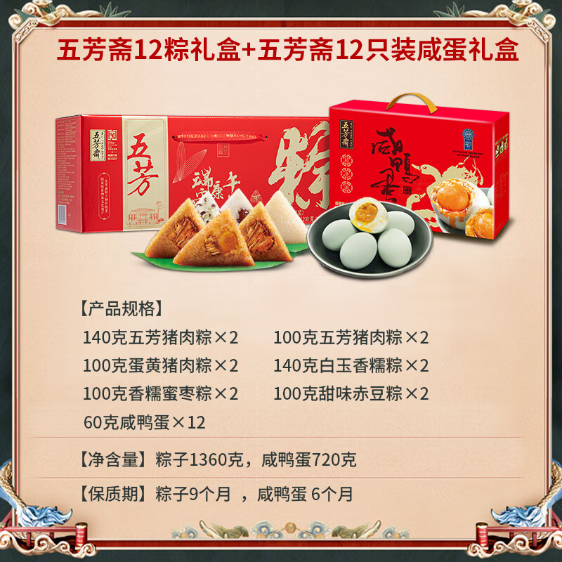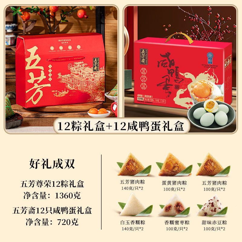 五芳斋粽子礼盒端午节2025年新款团购批发福利蛋黄咸鸭蛋嘉兴粽子 五芳斋尊荣粽子礼盒+五芳斋12只咸蛋礼盒