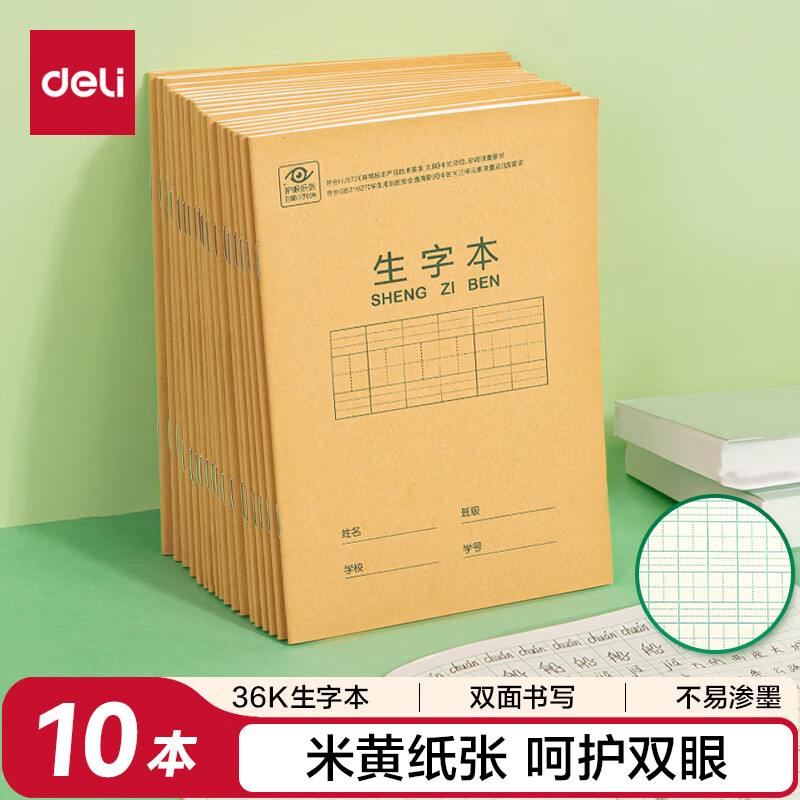 得力(deli)(deli)36K14张7行8列笔记本本子生字本小学生作业本牛皮纸日常作业必备10本装D3616