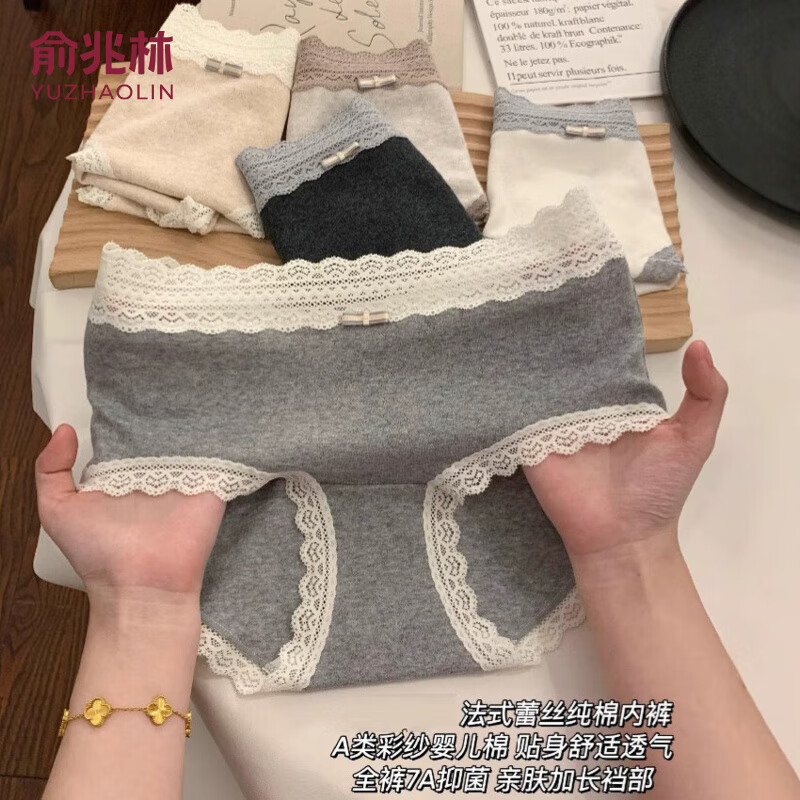 俞兆林内裤女纯棉裆中腰蕾丝边内裤包臀舒适薄款透气三角短裤4条盒装 纯色蕾丝边内裤 4条 L 100-120斤