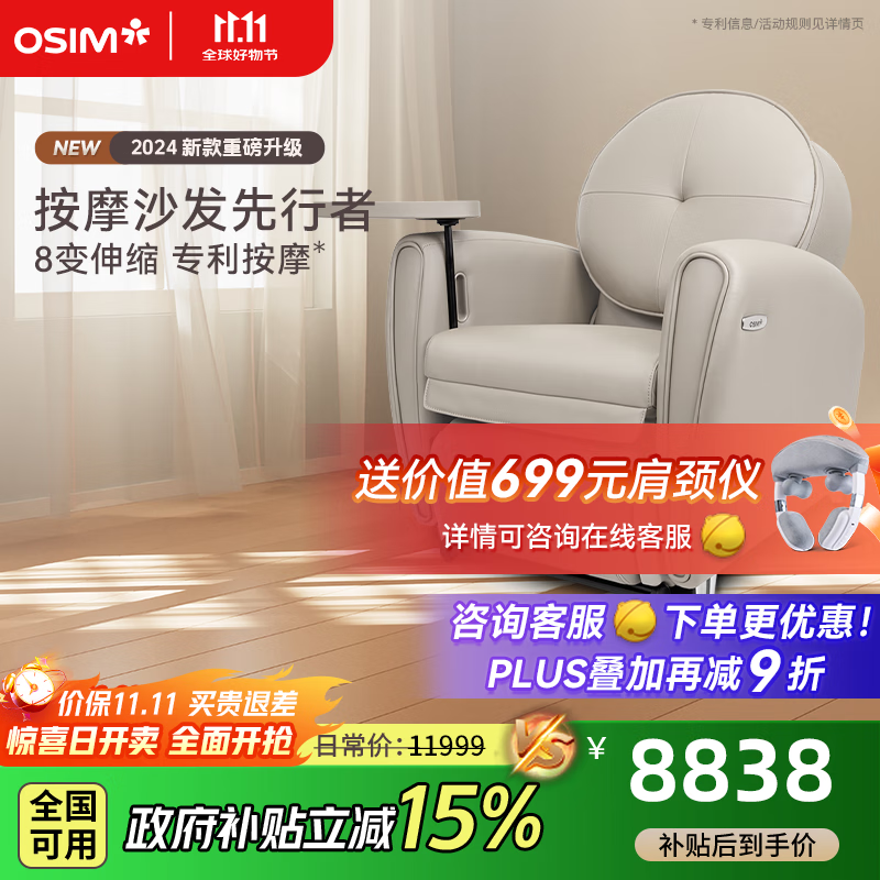 傲胜(OSIM)【政府补贴15%】按摩椅家用8变小天后Plus全身按摩沙发椅 OS-875P 珍珠灰 生日礼物实用送父母