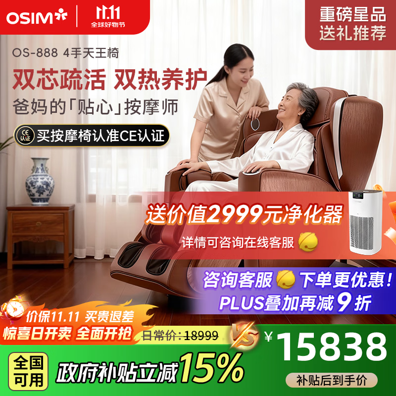 傲胜(OSIM)按摩椅家用 4手+双区热敷多功能豪华智能按摩沙发椅 按摩椅家用全身 OS-888 四手天王椅 棕色