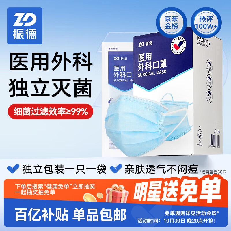 振德一次性医用外科灭菌口罩独立包装成人儿童冬季防粉尘雾霾甲醛50只